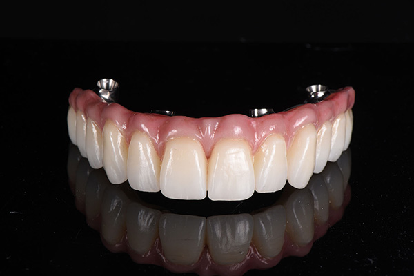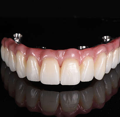 Hybrid implant denture is a full-arch prosthesis with the esthetics of conventional dentures and stability of implant-retained restorations. Supported by titanium posts anchored into the jawbone, this hybrid solution delivers long-term durability, greater chewing efficiency, and more patient comfort. It is an excellent choice for edentulous patients who desire a fixed, natural-appearing, and less costly solution over removable dentures.