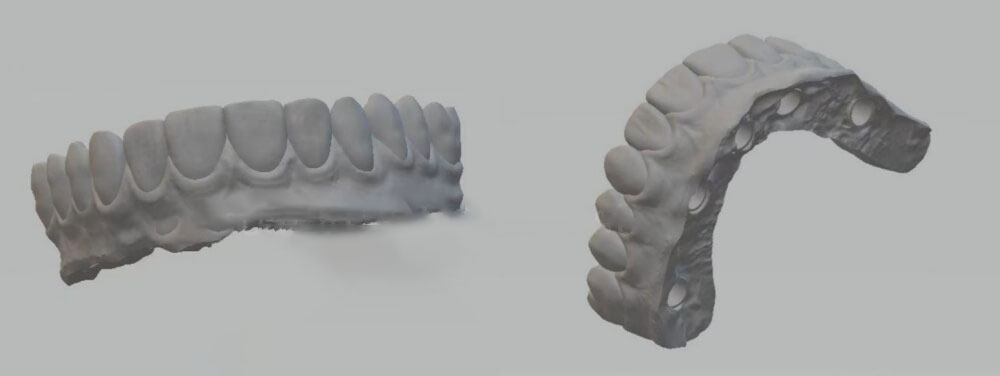 Very soon, we received upper and lower digital scans with bite. For the first time, we made an aluminum bar and a 3D printed resin bridge. The aluminum bar was to try fitting, while the printed resin bridge was to try bite. This process took 5 days to finish, because we sent our customer the design for approval.