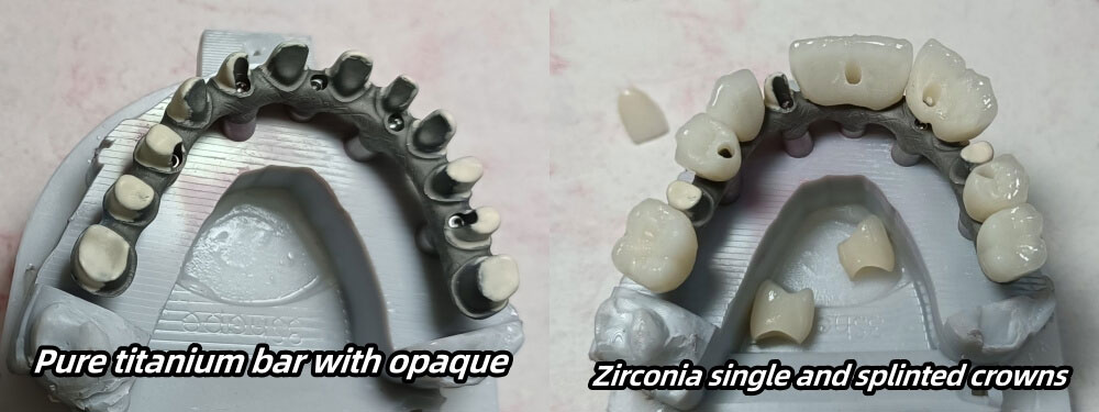 Titanium bar and zirconia porcelain crowns
