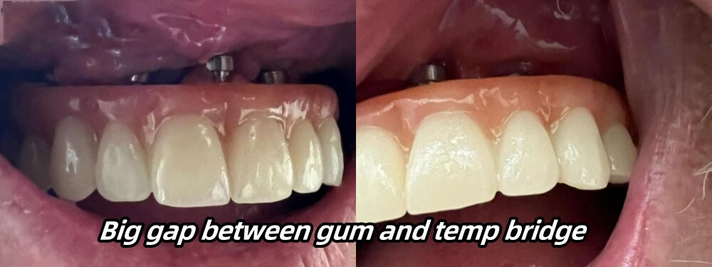 Very important notice: we were happy to learn that the patient was wearing a temporary bridge. On the pictures, we could see the gum had recessed, so there was a big gap between the gum and the bridge. But it was not problematic, since it was just a temporary bridge. We could fix that when it was time for a permanent bridge. That was  why we always suggest to make a temporary bridge first.
